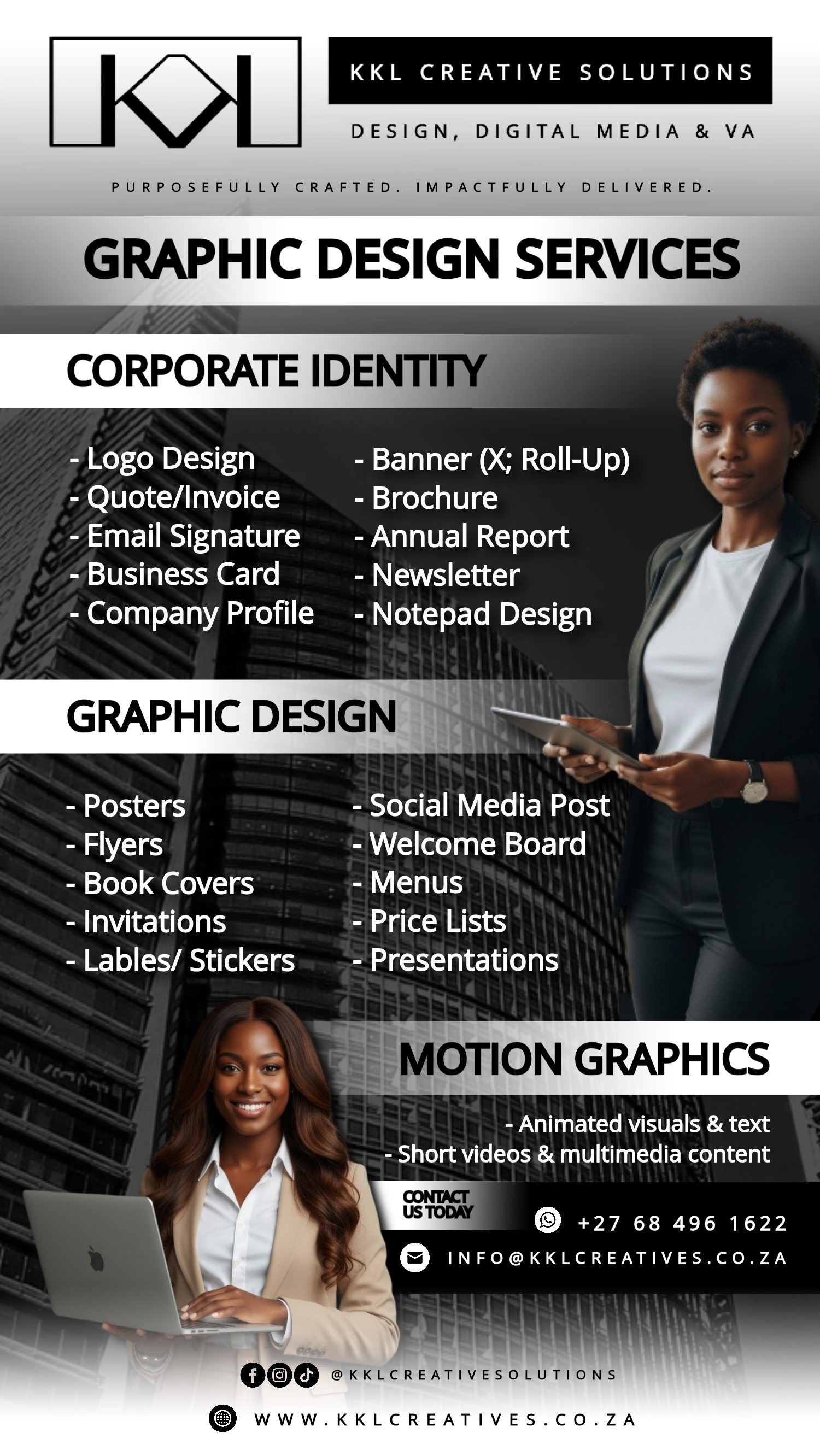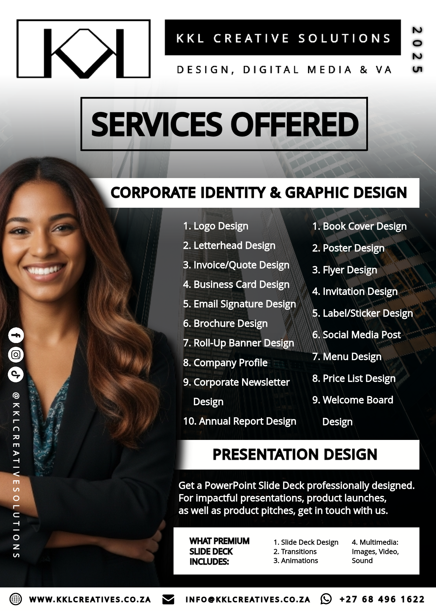 KKL Creative Solutions is a versatile creative solutions company providing creative services to ... businesses and individuals. We offer graphic design, layout design, digital content creation, branding support, admin/virtual assistance, and professional communication services. Clear, modern and reliable work that helps you show up professionally — online and offline.