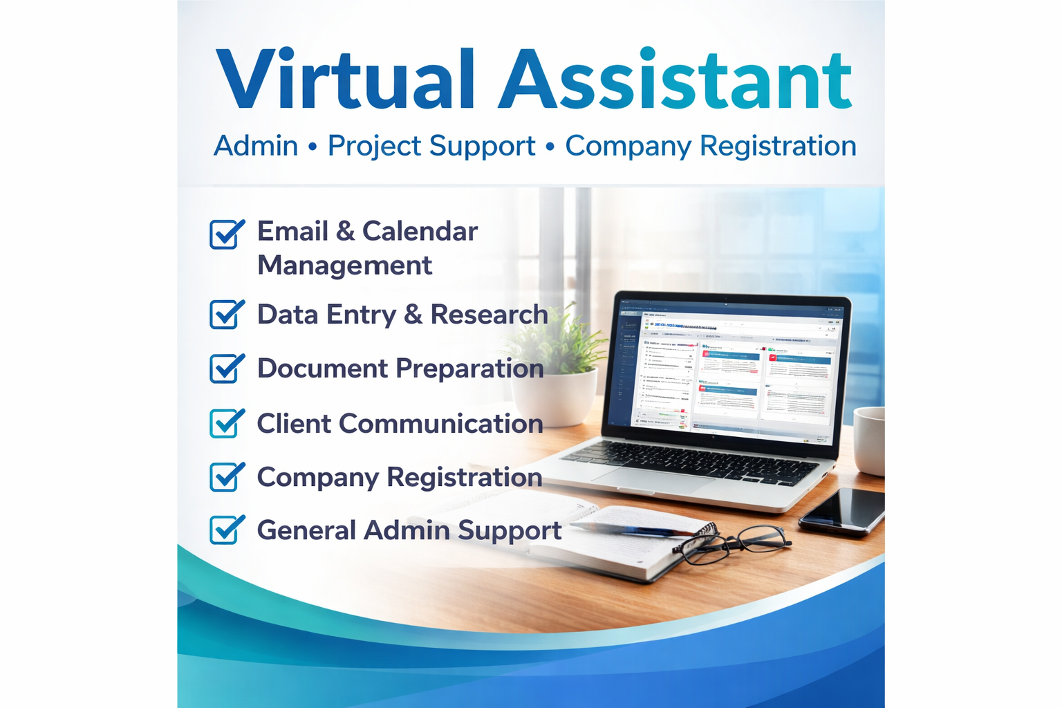 Your Reliable Virtual Assistance & Business Support Partner We help entrepreneurs, professionals, ... and growing teams run smoother, stay organised, and scale confidently. We support your business with: • Document preparation, research and reporting▪Client communication and scheduling • Project coordination and operational support ▪︎Company registration and business setup assistance